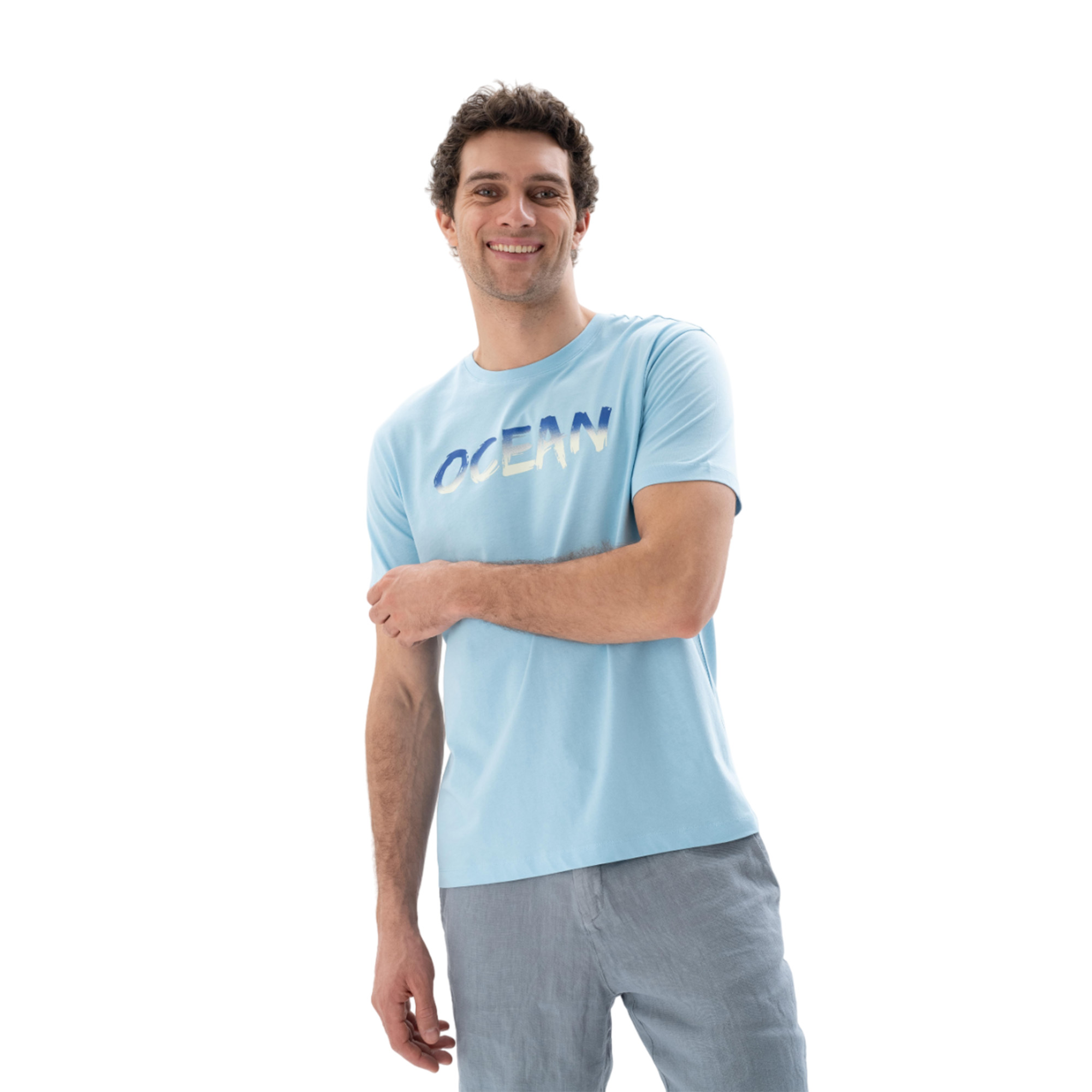 - Стильный голубой дизайн с крупной надписью на груди